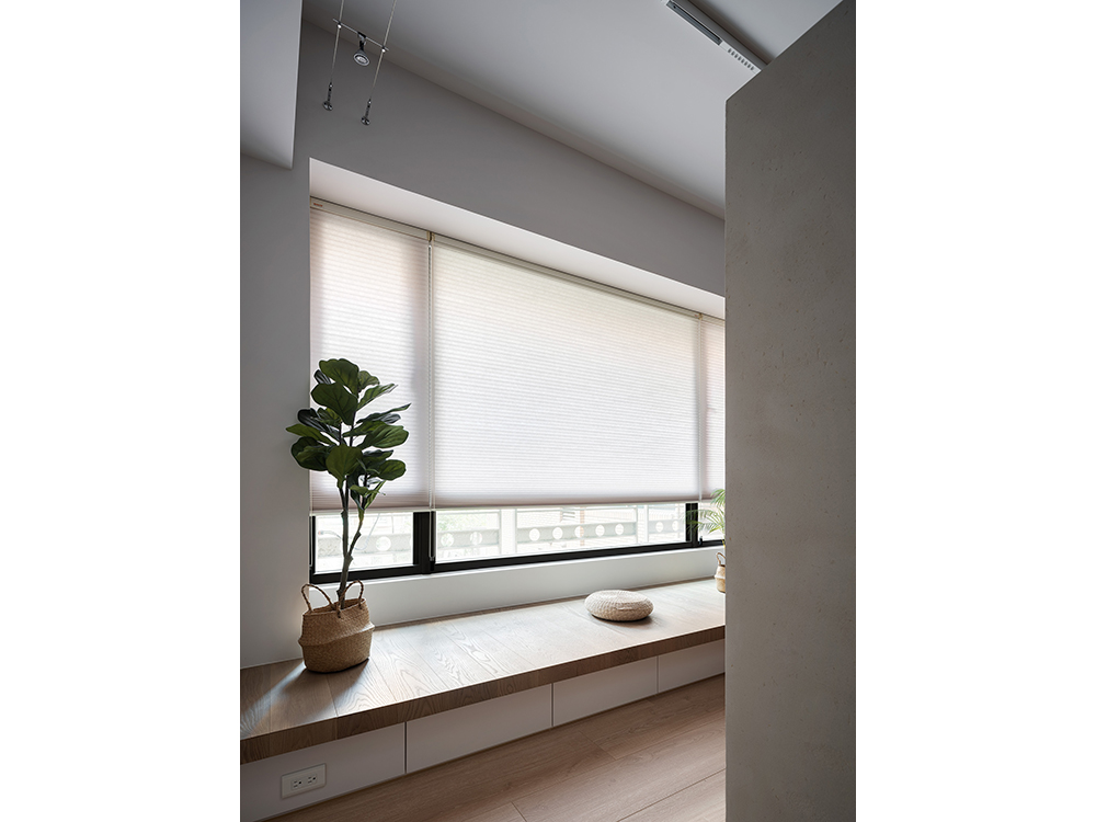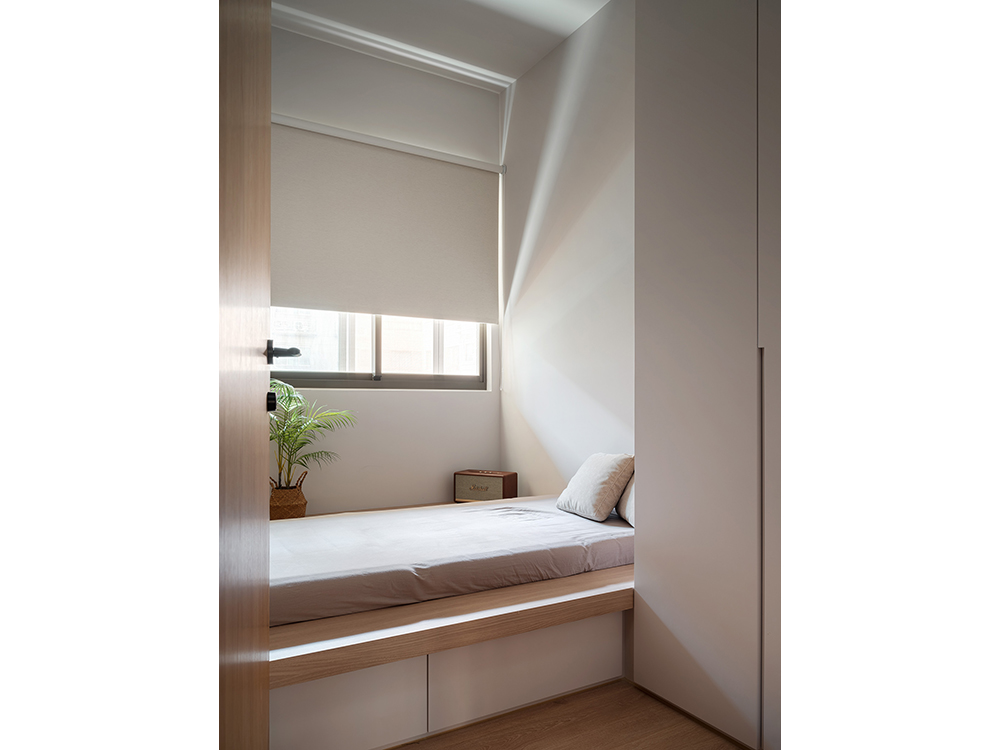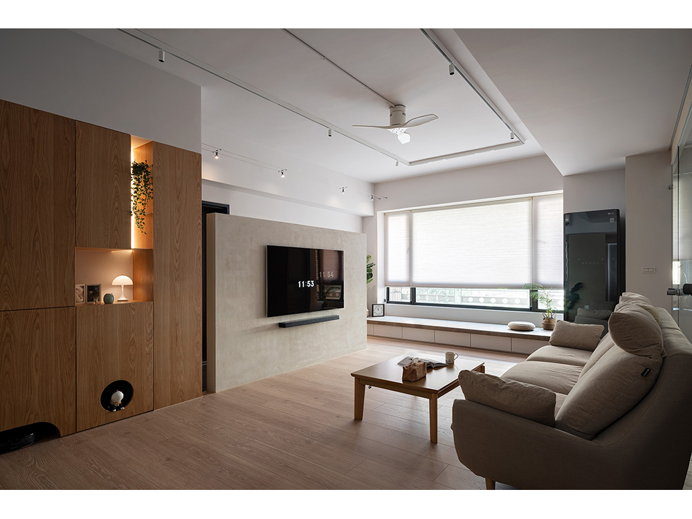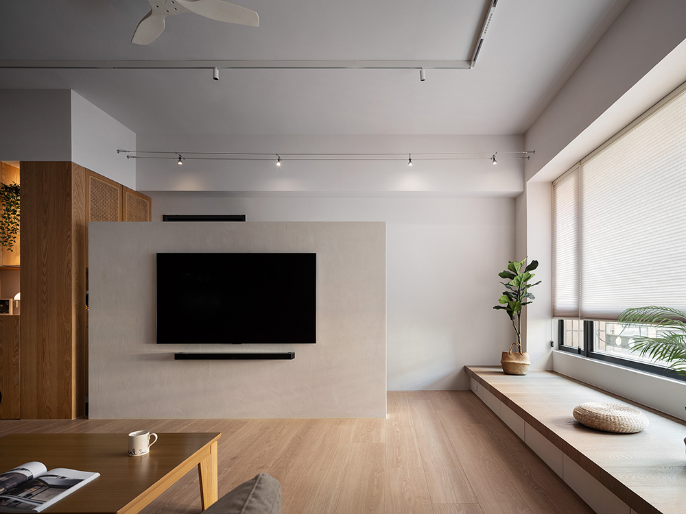 也使電視不再因大門位置而偏向角落,而窗邊的矮座可坐可臥,同時也兼俱收納功能。