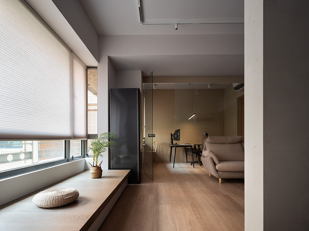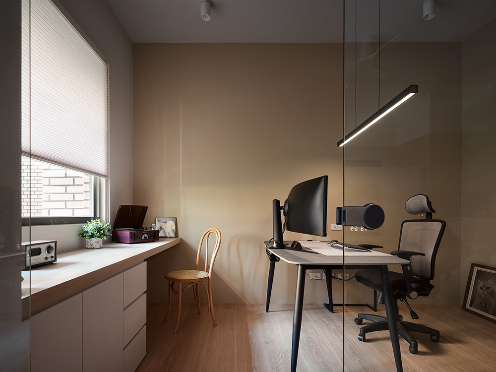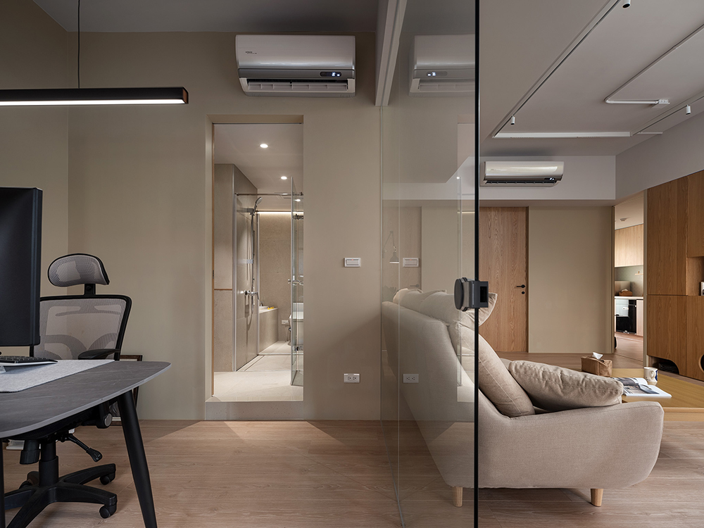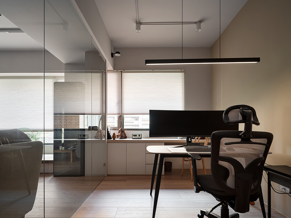 書房則以玻璃隔間設計,讓光線自由流動,創造出明亮而開放的工作環境。