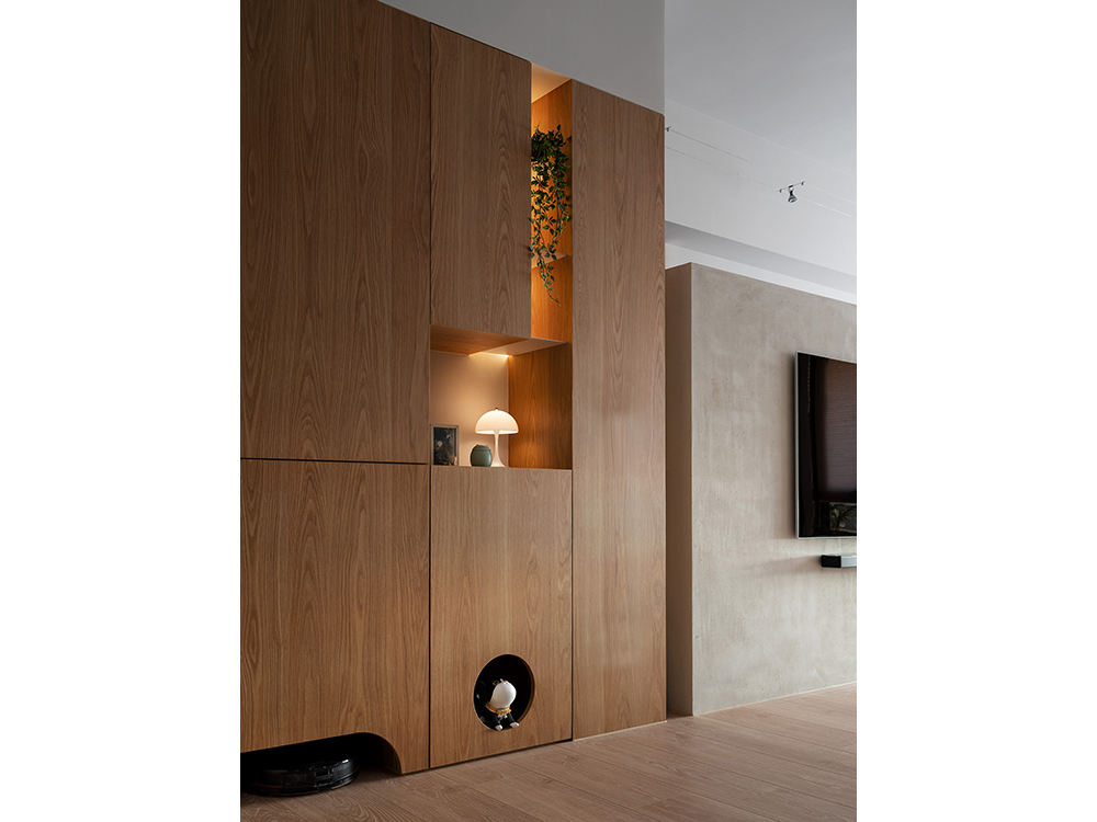 為了劃分玄關與起居區,我們設置了一道180公分高的矮牆,有效提升空間感,