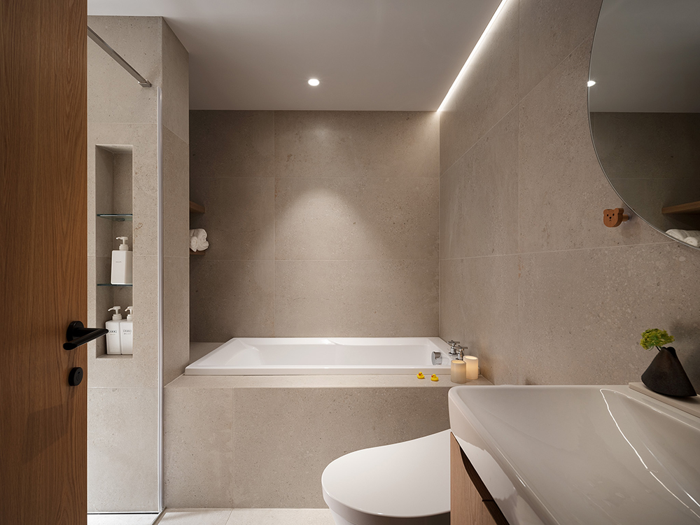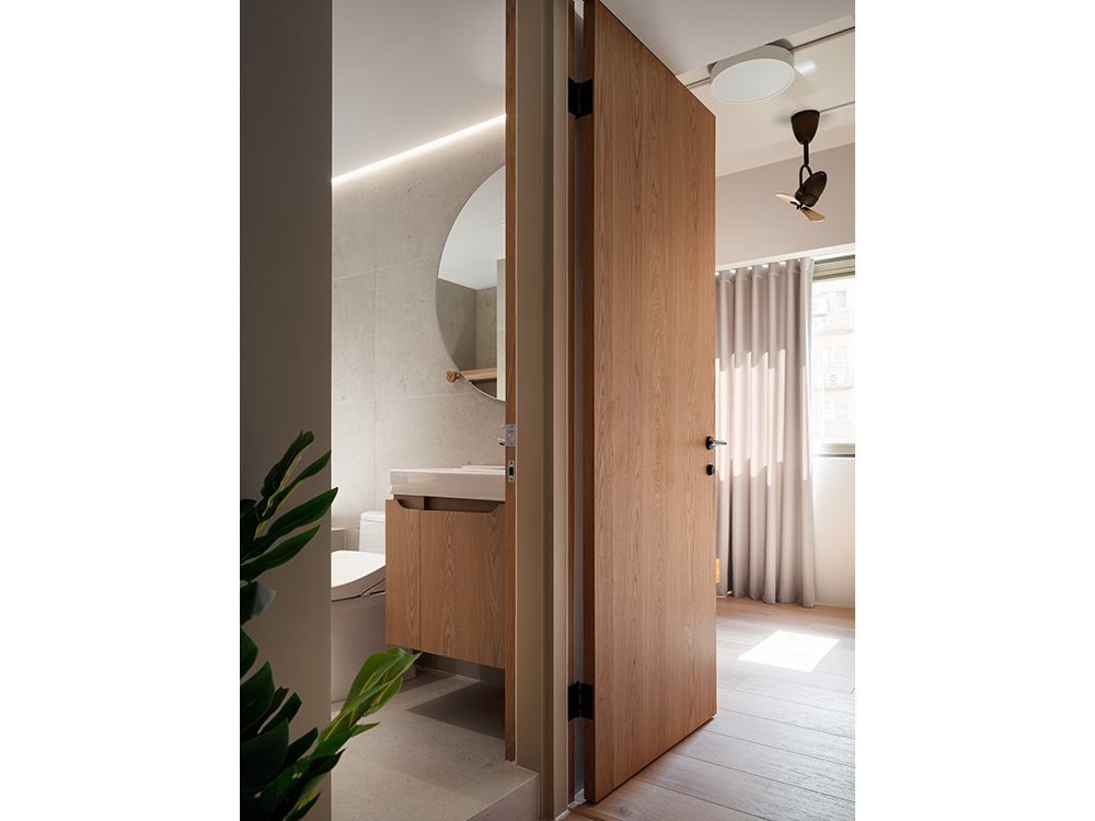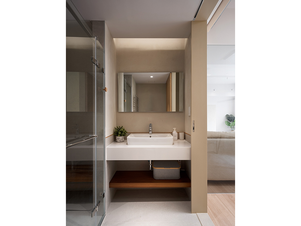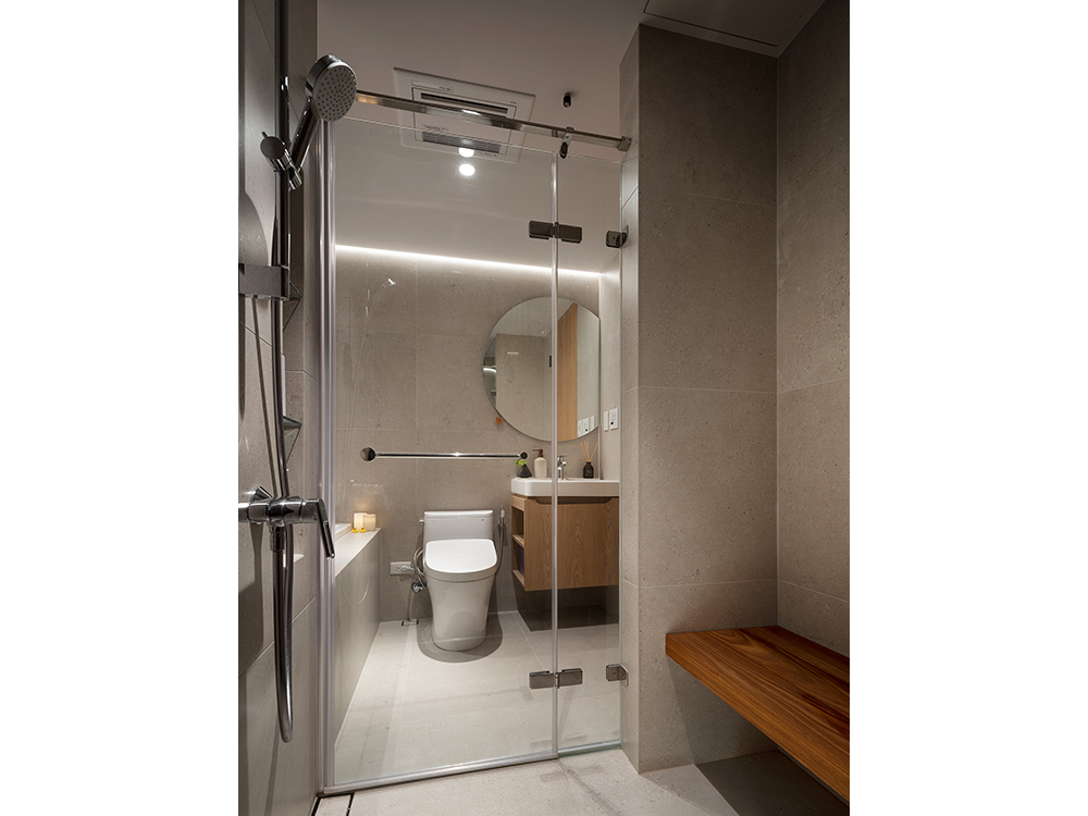 便將原本的兩間衛浴合併為一間寬敞的大衛浴以及1套半的衛浴設備,以淋浴區進行區隔,提升使用時的舒適性。