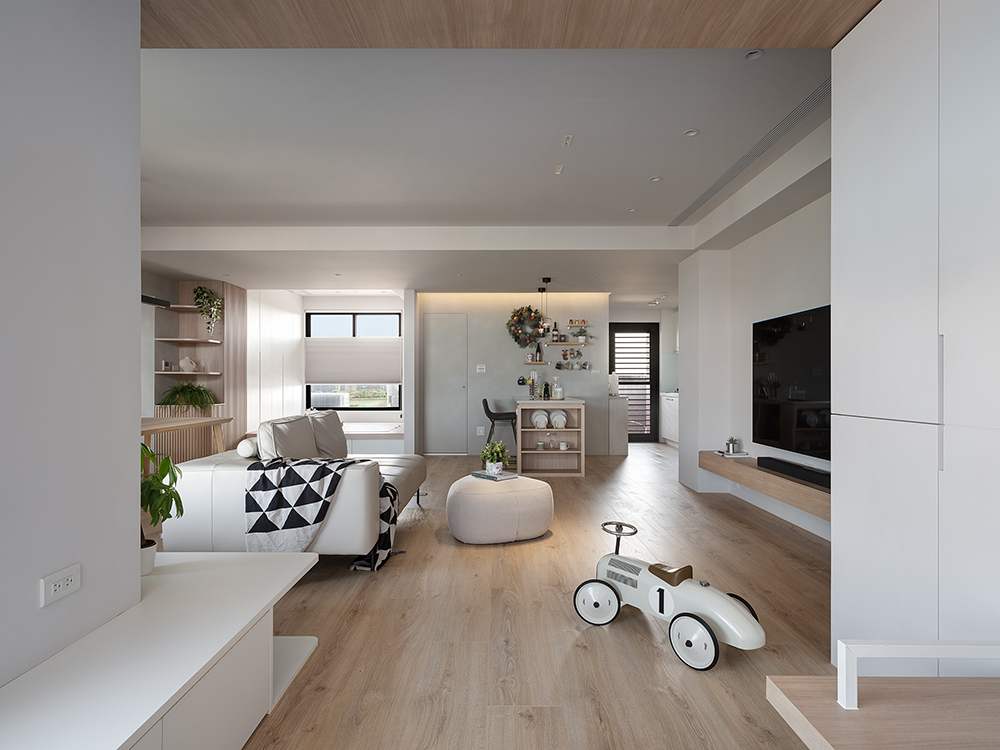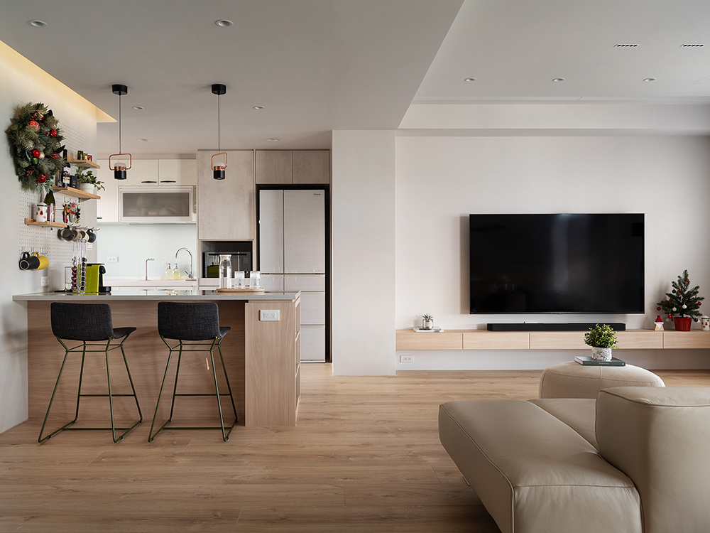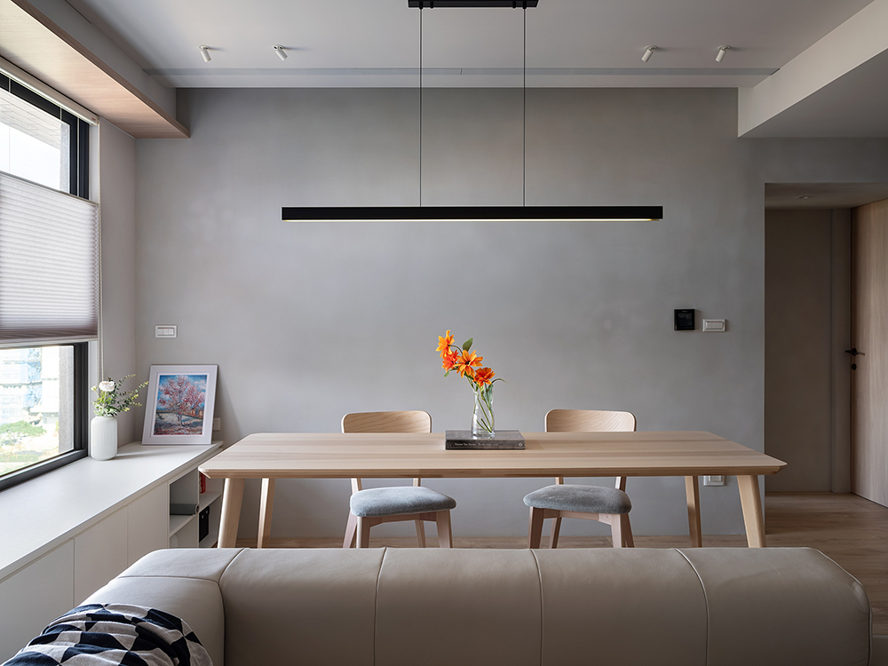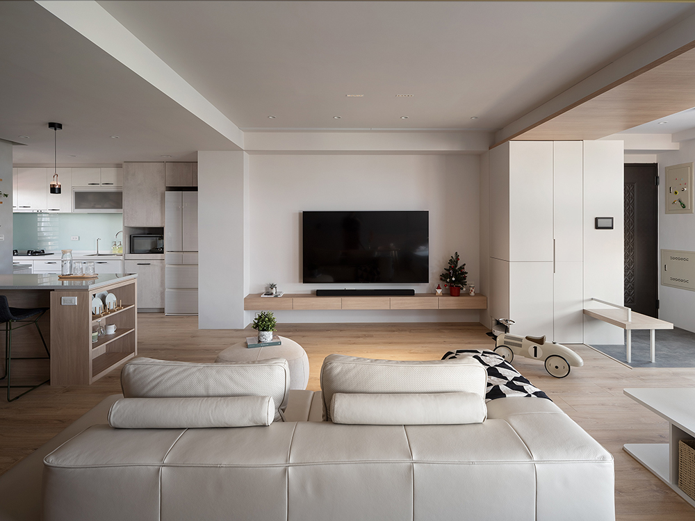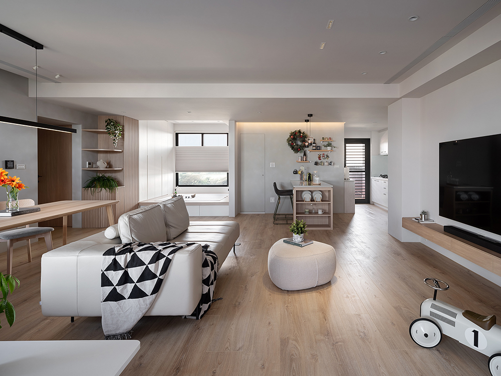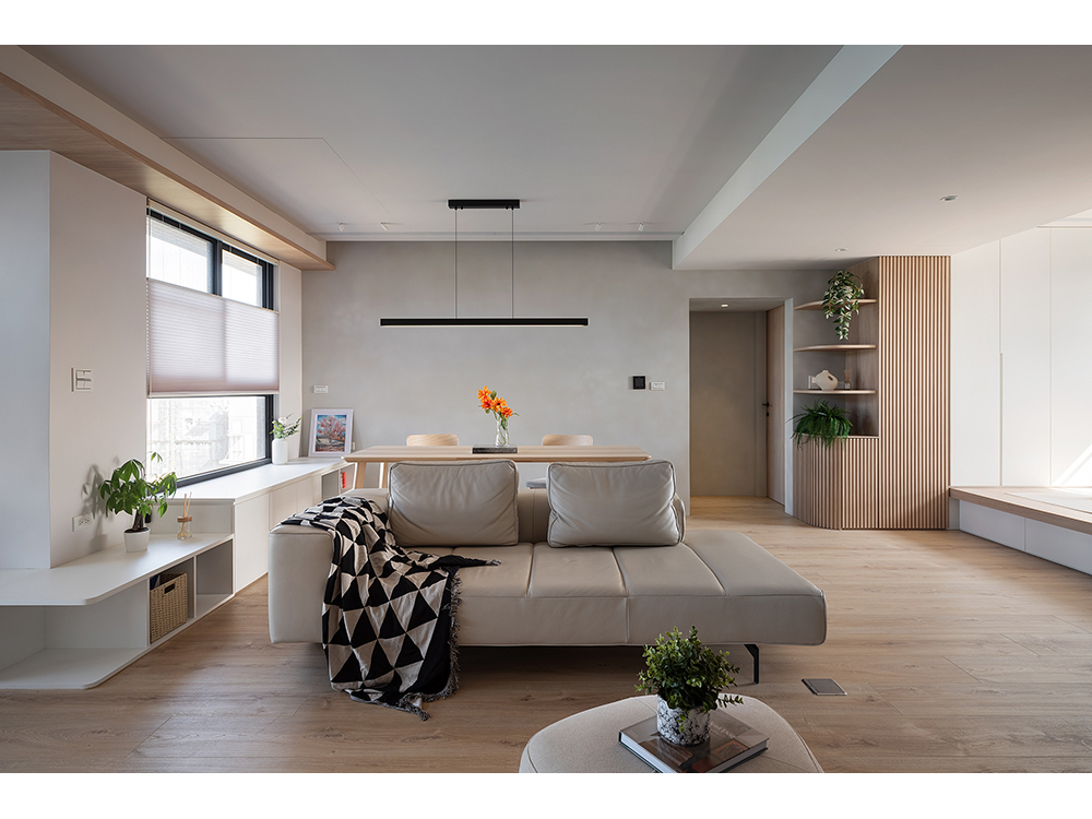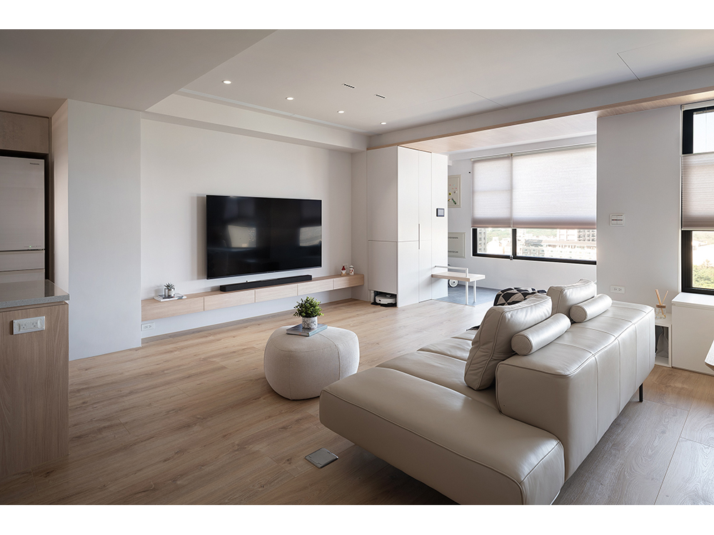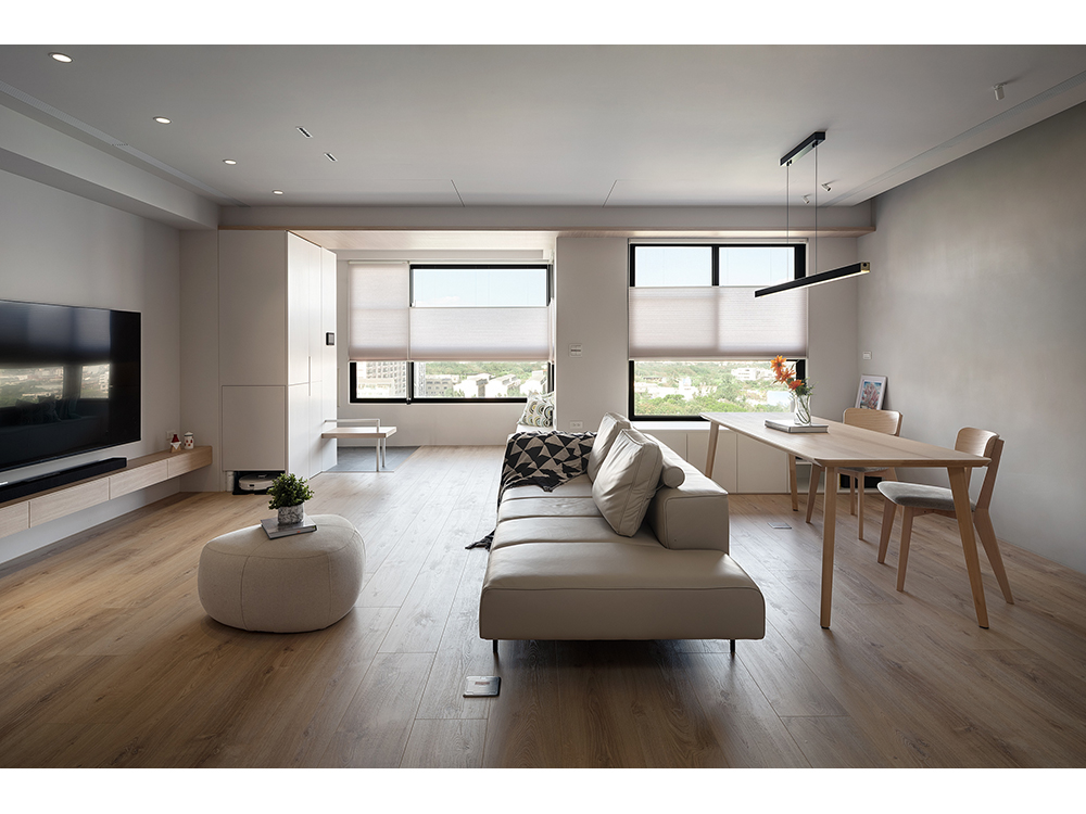 這是為一對年輕夫妻打造的日常居所。原有的四房格局,捨去一房換來開闊的公共空間,並將另一房改為開放式的多功能室,讓光線與空氣得以自在流動,平時也可做為瑜珈冥想空間,偶爾成為臨時客房。整體以簡約明亮為主調,溫潤木地板與紋理漆牆面,讓每個角落都自然、舒適。家,不需過多裝飾,只需留給生活更多餘裕,讓每一天都能靜好安放。